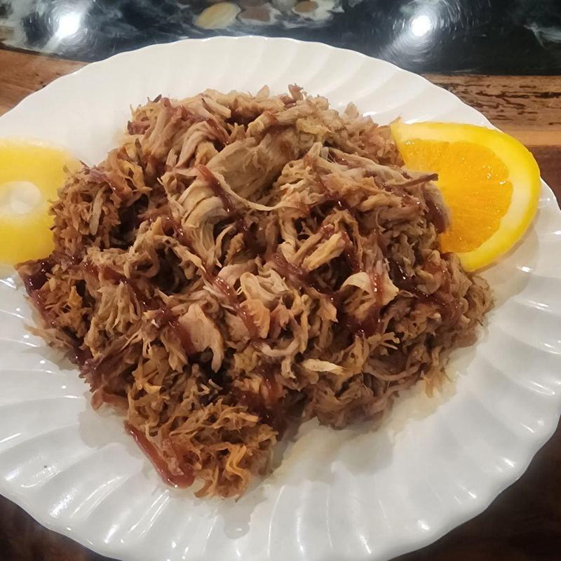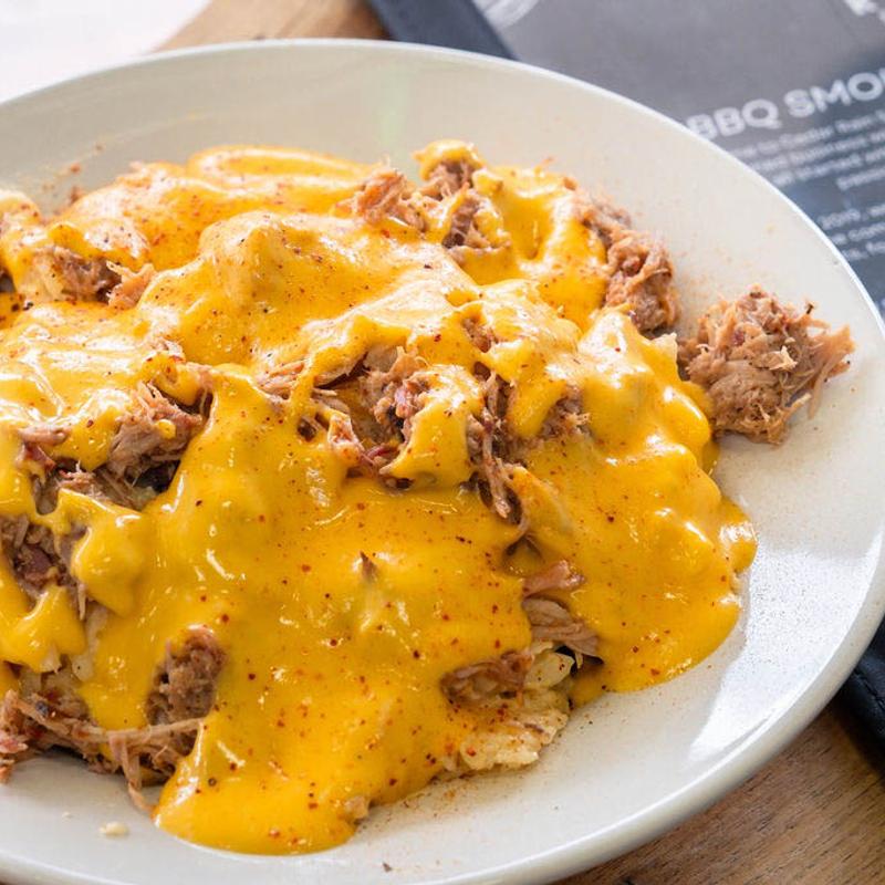 Our Pulled Pork starts with a family-made rub recipe that perfectly balances sweet and savory notes. It's then smoked low and slow, allowing the flavors to deeply infuse within the meat, and pulled apart by hand. To finish, we top it with a carefully selected assortment of spices, creating a tender and flavorful dish.
